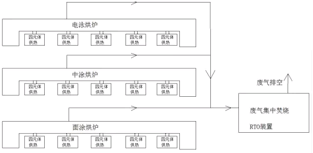 RTO系统是三个烘炉废气集中送至蓄热式RTO焚烧炉焚烧,直接排空,废气排空温度较高。烘干室供热由四元体单独提供。